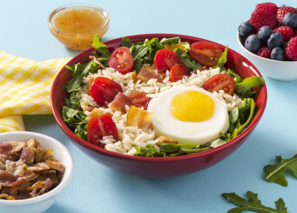 Bacon works beautifully as a delicious salad topping, like in this Bacon and Egg Rice Salad. We’re moving beyond a classic Cobb salad for a simple meal made with a hearty base of a Minute White Rice Cup, arugula, grape tomatoes, bacon, egg and store-bought Italian dressing. Not only is it delicious, but you can put it together in just 5 minutes.