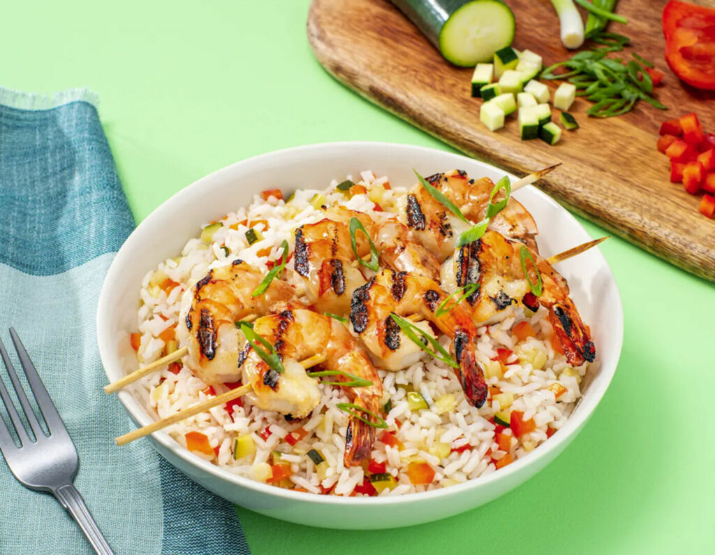 This All-in-One Shrimp Skewers with Grilled Rice recipe is perfect to enjoy outdoors on a beautiful day. Shrimp marinated in Italian dressing are paired with grilled rice, which is a fun and unique dish to create on the grill. In a pouch of aluminum foil, place Minute Instant White Rice, bell peppers and zucchini and add chicken broth and Italian dressing, leaving room for air to circulate. The liquid will be absorbed by the rice while on the grill, imparting delicious flavor to the rice and vegetables along with the smoky taste of the grill.