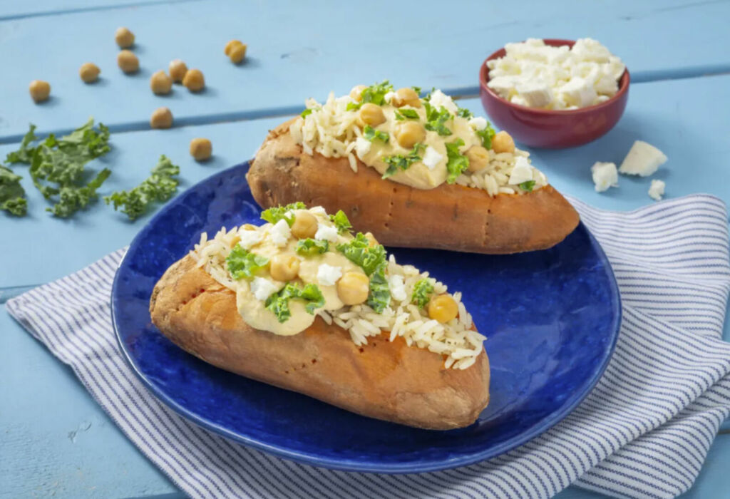 Another meal packed full of Mediterranean flavors is this Pesto Rice with Roasted Red Peppers, Mushrooms and Feta. Atop aromatic Minute Jasmine Rice Cup, mushrooms are an excellent meat alternative to bring some savory, umami flavor to the dish. This dish also makes great leftovers—try it as an omelet filling or in scrambled eggs the next morning! If you love feta cheese, you can also try this Power Rice-Stuffed Sweet Potato, which packs a lot of protein from chickpeas, hummus and feta to fuel your day.