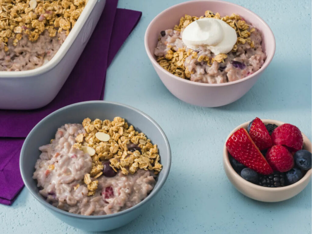 Sprinkle the rice pudding with your favorite granola to add a great crunch to the dish. For even more creamy goodness, you can also top with ice cream or a dollop of whipped cream. The Berry Rice Pudding Crumble can be served hot or cold, so you can prepare this dish ahead of time and keep it refrigerated so it’s always on hand.