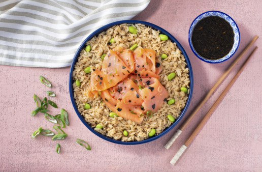 Our Smoked Salmon Poke Bowl with jasmine rice combines a light, Asian-style dressing, edamame and smoked salmon with Minute® Ready to Serve Cilantro & Lime…