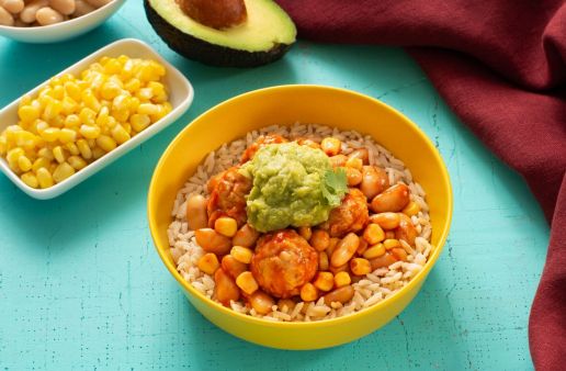 Red enchilada sauce makes a tasty base for this simple chili that’s prepared with frozen turkey meatballs, white rice, beans and guacamole.